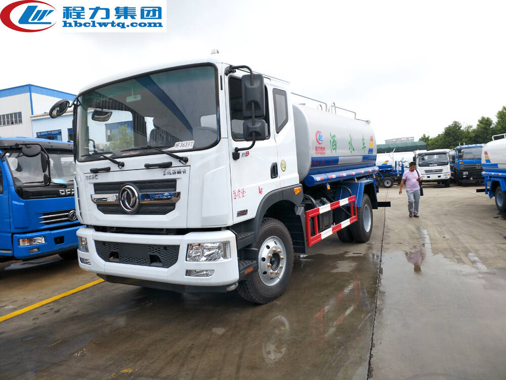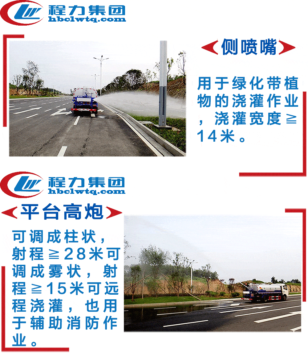 上装配置:罐体容积为12立方洒水车,罐体钢板为4mm碳钢Q235材质,罐内隔板具有防波作用,以减轻汽车行驶时罐体液体冲击,罐体及整车外形尺寸按照公告。带大功率专用洒水泵,泵可自吸自排,整车前冲、后洒、侧喷、带65消防接口,后平台带绿化洒水炮,洒水炮可全方位旋转,可连续调成直冲状、大雨、小雨、毛毛雨;前封头带水位计,后平台主管路带1寸浇花接口,后爬梯。平台后部带小安全告知牌:“随时停车,注意安全”,带两根水管及阴阳端。罐体颜色:上白/下蓝,银灰/银蓝,罐体两侧喷“洒水车、绿化喷洒车”字样,贴反光标示。洒水车可加装前冲后洒气动阀驾驶室控制、可加装雾炮机组发电机组喷雾降尘装置、车头可加装推雪雪铲、雪滚装置街道、公路除雪等。